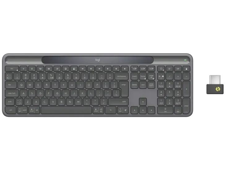 Logitech Slim Solar+ to pełnowymiarowa klawiatura biurowa z niskoprofilowymi przełącznikami. Łączność bezprzewodowa przez Bluetooth lub odbiornik (2.4 GHz). Wbudowany panel solarny doładowuje akumulator (70 mAh Li-Ion).