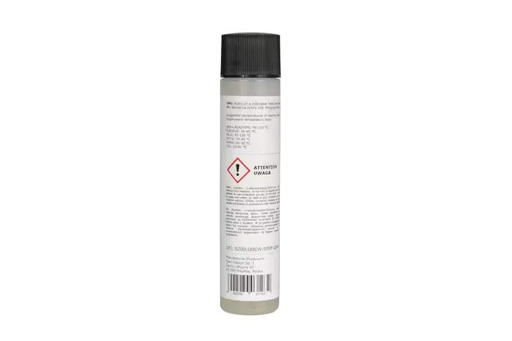 Po zakończeniu drukowania klej można łatwo usunąć, wystarczy zmyć go wodą, nie pozostawiając śladów na powierzchni stołu. Ponadto klej cechuje się wysoką odpornością na temperatury, co sprawia, że doskonale sprawdza się przy różnych ustawieniach grzania stołu roboczego, oferując solidną przyczepność w szerokim zakresie temperatur. Klej adhezyjny Devil Design jest niezawodnym dodatkiem, który zapewnia stabilność i precyzję wydruków, co znacząco ułatwia proces druku 3D, niezależnie od rodzaju stosowanego filamentu.