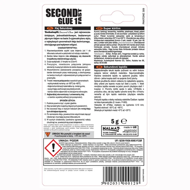 Jednoskładnikowy, bezbarwny płynny klej na bazie 2-cyjanoakrylanu etylu o najwyższych parametrach kleju technicznego, sieciującego pod wpływem wilgoci. Skleja bardzo mocno w ciągu kilku sekund różne materiały. Stosowanie kleju jest bardzo łatwe dzięki niesklejającemu się dozownikowi kropelkowego wielokrotnego użycia. Wystarczy jedna kropla, aby uzyskać mocne i niewidoczne połączenie. Charakteryzuje się bardzo dobrą odpornością na obciążenia wibracyjne, wysychając zachowuje swą elastyczność, wykazuje odporność na temperatury od -55oC do +80oC. Posiada zastosowanie w gospodarstwach domowych, motoryzacji, a nawet w bardzo trudnych i odpowiedzialnych połączeniach w przemyśle.