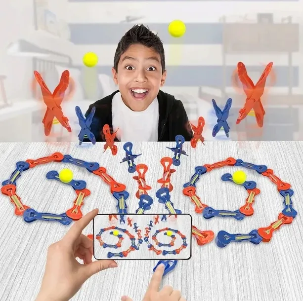 KlikTrix to mnóstwo elementów, które można ze sobą łączyć, tworząc z nich widowiskowe aranżacje i wybuchowe sceny. To zabawa na zasadzie reakcji łańcuchowej / efektu domina. Produkt charakteryzuje dbałość o detale, jakość i precyzja wykonania. Twórz własne projekty! Rób zdjęcia, nagrywaj filmiki i udostępniaj! Szykuj się na wystrzałowe efekty! KlikTrix, ze względu na swoją specyfikę, świetnie sprawdza się w mediach społecznościowych. Zawartość opakowania: • 16 dwuczęściowych klikerów, • 3 piłki, • 1 wyrzutnia, • 18 gumek, • 1 przyrząd do nakładania gumek.