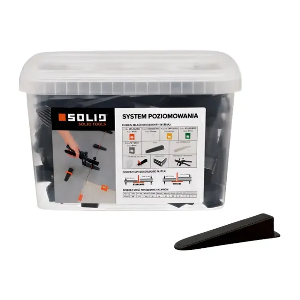 Kliny wykonane zostały z twardego tworzywa dzięki czemu służą do wielorazowego użytku. Pasują do każdego rodzaju klipsów w Systemie poziomowania płytek Solid. Zapakowane w podręcznym wiaderku, które pomaga w utrzymaniu czystości podczas wykonywanych prac jak i przechowywania klinów.