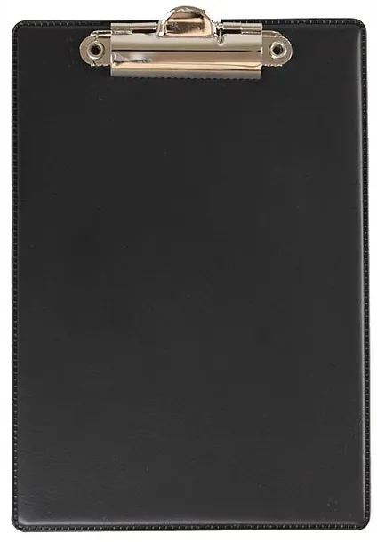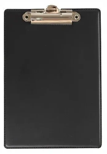 Wykonany z kolorowej folii PVC. Środek usztywniony tekturą. Wyposażony w sprężysty mechanizm zaciskowy służący do przytrzymywania kartek. Podkładka pojedyncza. Format A6. Dostępny w trzech kolorach: niebieski, granat, czarny.
