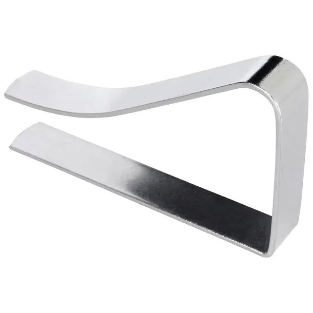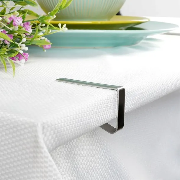 Metalowy klips do obrusu. Doskonale przytrzymuje obrus na blacie stołu i zapobiega jego zsuwaniu. Przyda się w każdym domu, w ogrodzie, na tarasie lub balkonie. Niezbędny w trakcie wietrznej pogody podczas przyjęć lub pikników organizowanych na świeżym powietrzu. Praktyczny, wytrzymały klips zapewni stabilne utrzymanie obrusu, co zabezpieczy postawione na obrusie naczynia przed zsunięciem się ze stołu i upadkiem. Wyprodukowano zgodnie z europejskimi standardami.