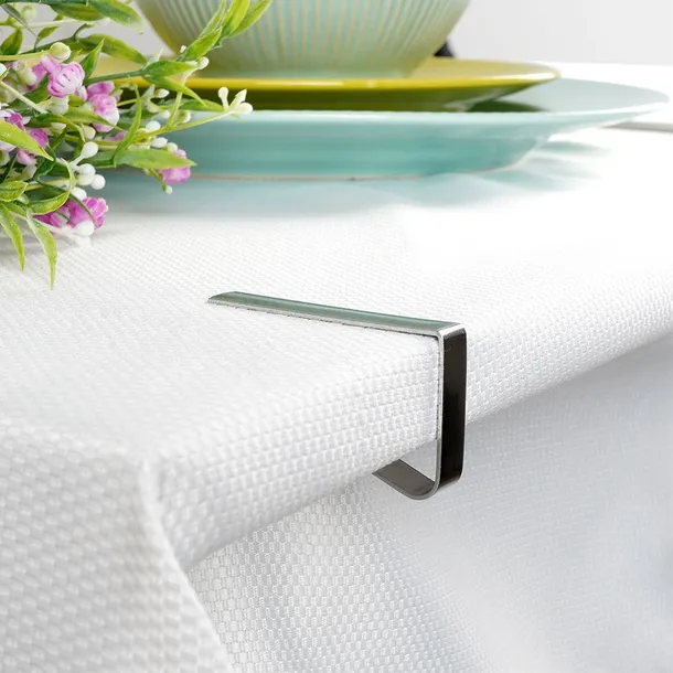 Metalowy klips do obrusu. Doskonale przytrzymuje obrus na blacie stołu i zapobiega jego zsuwaniu. Przyda się w każdym domu, w ogrodzie, na tarasie lub balkonie. Niezbędny w trakcie wietrznej pogody podczas przyjęć lub pikników organizowanych na świeżym powietrzu. Praktyczny, wytrzymały klips zapewni stabilne utrzymanie obrusu, co zabezpieczy postawione na obrusie naczynia przed zsunięciem się ze stołu i upadkiem. Wyprodukowano zgodnie z europejskimi standardami.