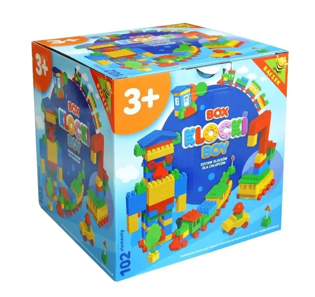 Zestaw klocków konstrukcyjnych składający się ze 102 elementów zapakowany w kolorowe pudełko. Produkt wykonany jest wyłącznie z bezpiecznych i certyfikowanych surowców. Zestaw charakteryzuje się bogatą kolorystyką oraz różnymi kształtami co sprawia, że Twoje dziecko poprzez zabawę rozwija swoją wyobraźnię, zdolności manualne oraz pobudza kreatywność. Dzięki dołączonym elementom takim jak autka, pojazdy, podwozia z kółkami, daszki, okienka, drzewa, płotki, znaki drogowe mamy nieograniczoną możliwość tworzenia wymarzonych domów czy też niepowtarzalnych konstrukcji. Zestaw występuje również w dziewczęcej konfiguracji kolorów.