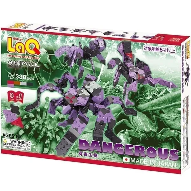 "LaQ Dangerous" to zestaw aż 8 groźnych zwierząt, z których można zbudować pająka tarantulę, osę, smoka z Komodo, mrówkę kulkę i inne niebezpieczne zwierzęta z całego świata. Zestaw wyróżnia się dzięki nowemu lawendowemu kolorowi części LaQ. Seria najbardziej trujących stworzeń, która uzupełnia już istniejącą kolekcję zwierząt. Skonstruowane modele odzwierciedlają cechy prawdziwych zwierząt i mogą być świetnym sposobem na wzbogacenie lekcji przyrody w szkołach. 330 części; 8 schematów konstruowania: Pająk Tarantula, osa, smok z Komodo, mrówka kula itp. 5 kolorów; NOWOŚĆ: Nowe lawendowe części z kolekcji LaQ w zestawie! Zalecany wiek: 5+ Poziom trudności: Średni Części LaQ są wielokrotnego użytku, a zestaw może być użyty do przebudowy nawet 8 różnych modeli. MADE IN JAPAN