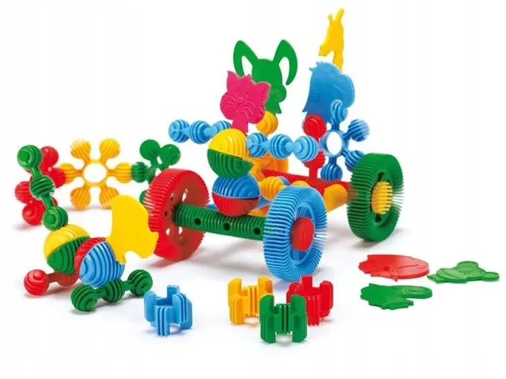 - wśród klocków m.in. takie o kształcie główek zwierząt, takich jak: żyrafa, pies, kotek, koń, małpka, papuga, zając i słoń, które w połączeniu z innymi klockami idealnie układają się w postać wybranego zwierzątka oraz inne przedmioty