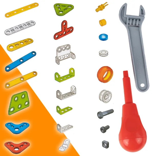 Elastyczny konstruktor Build&Play składa się z dużych kolorowych części, które są ze sobą skręcone. Elementy można łatwo łączyć ze sobą. W zestawie znajduje się również klucz i śrubokręt do rozwijania umiejętności początkującego inżyniera.