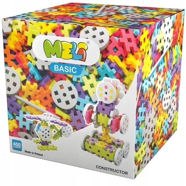 Zestaw edukacyjnych klocków MELI CONSTRUCTOR 400 to aż 370 podstawowych, płaskich elementów do budowania, uzupełnionych o 30 elementów do zadań specjalnych.