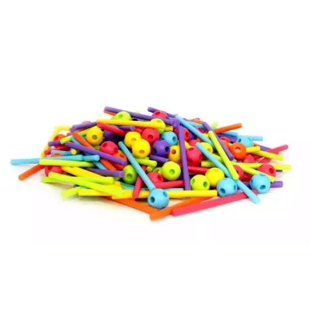 - Zestaw zawiera 150 elementów, w tym łączniki w formie patyczków oraz kuleczek z otworami,