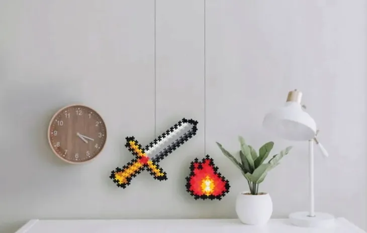 Puzzle po numerach z klocków - zestaw klocków konstrukcyjnych PLUS-PLUS miecz i ogień , rozmiar MINI, 250 elementów.