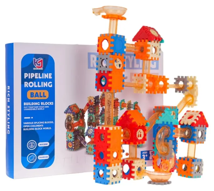 Ogromny zestaw klocków z zaczepami, torem i piłką dla dzieci od 3-go roku życia. Zestaw składa się z 246 elementów, z których zbudować możemy konstrukcję toru dla piłki. W instrukcji znajduje się przykładowa konstrukcja, ale dziecko stworzyć może również budowle według własnego pomysłu, co rozwija kreatywność i logiczne myślenie. Zestaw wykonany jest z najlepszej jakości plastiku w żywych kolorach przyciągających wzrok dziecka. Na klockach z zaczepami, nakleić możemy kolorowe obrazki. Zaczepy dobrze trzymają, a cała konstrukcja jest niezwykle stabilna. Po zbudowaniu konstrukcji należy górnymi lejkami włożyć piłeczkę, a ona poleci w dół, pokonując liczne zakręty. Obserwowanie toczącej się piłeczki jest niezwykle uspokajające i relaksujące.