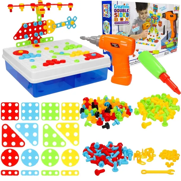 Pudełko z plastikowymi figurami do przykręcaniaTworzenie różnych konstrukcjiZabawka kreatywna rozwijająca zdolności manualne oraz wyobraźnie u dzieciCertyfikat CENieodpowiednie dla dzieci poniżej 3-go roku życiaSugerowany wiek dziecka: 5+ latW zestawie:Plastikowa podstawaWkrętarkaKlucz płaskiŚrubokręt248 elementów plastikowych figur i śrubekKsiążeczka z różnymi wzorami do tworzeniaZasilanie wkrętarki:Baterie 2x AA (brak w zestawie)Wymiary zabawki:Szerokość: 24 cmDługość: 25 cmWysokość: 7 cmWymiary opakowania:Długość: 40 cmSzerokość: 25 cmWysokość: 7,5 cmZabawka zapakowana w oryginalnie opakowanie producentaKod produktu: KRE044