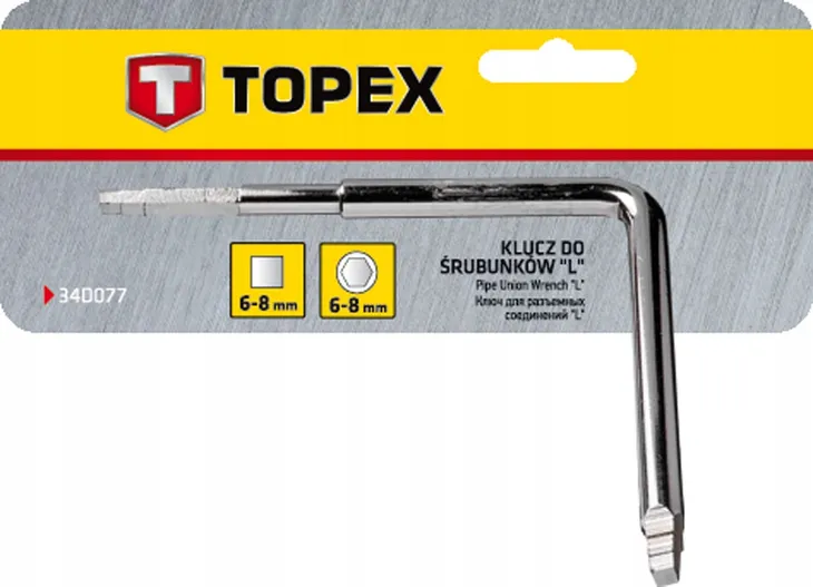 Klucz do śrubunków TOPEX (nr ref. 34D077) typu L o rozmiarach: kwadrat 6 - 8 mm, sześciokąt 6 - 8 mm. Przeznaczony między innymi do montażu i demontażu łączników z gwintem zewnętrznym, śrubunków. Wykonany ze stali węglowej hartowanej. Marka TOPEX skierowana jest do majsterkowiczów.