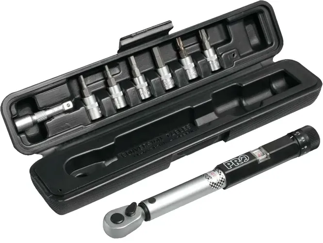 PRO Torque Wrench to precyzyjny klucz dynamometryczny do bezpiecznego montażu elementów kokpitu i sztycy. Regulacja w zakresie 3–15 Nm pozwala dokręcać śruby zgodnie ze specyfikacją producenta, a kompaktowa konstrukcja z walizką i zestawem nasadek Cr-V (M3, M4, M5, M6, T25, T30) oraz przedłużką ułatwia dostęp do głęboko osadzonych śrub.