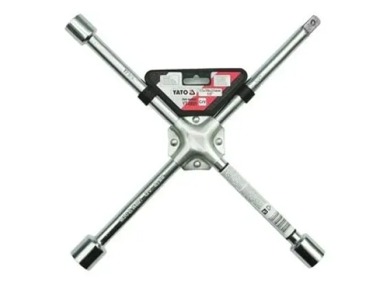 Krzyżakowy klucz do kół samochodowych. Wykonany z wysokiej jakości stali chromo-wanadowej. Posiada 4 ramiona z nasadkami dostosowanymi do wszystkich sześciokątnych, metrycznych rodzajów śrub i nakrętek stosowanych w samochodach osobowych i lekkich dostawczych. Krzyżak został wzmocniony dodatkowo podwójną, nitowaną blachą stalową. Podnosi bezpieczeństwo i komfort użytkowania. Klucz szczególnie polecany do serwisów opon oraz jako wyposażenie samochodów osobowych.