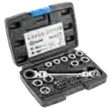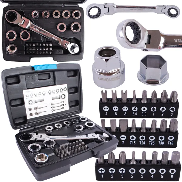 Klucz z grzechotką z przegubem i zestawem specjalnych nasadek, który doskonale sprawdzi się przy odkręcaniu i przykręcaniu połączeń gwintowanych zakończonych elementem mocującym sześciokątnym. Dzięki grzechotce nie zachodzi potrzeba przekładania klucza, natomiast nasadki umożliwiają pracę ze śrubami w różnych rozmiarach. 36-elementowy zestaw umożliwia uzyskanie pełnego zestawu kluczy w rozmiarach 8 – 19 mm. Dodatkowo zawiera 24 końcówki wkrętakowe wraz z adapterem. Uniwersalne zastosowanie klucza pozwala na jego użycie zarówno w warsztacie, jak i pracach remontowo - budowlanych oraz instalatorskich.