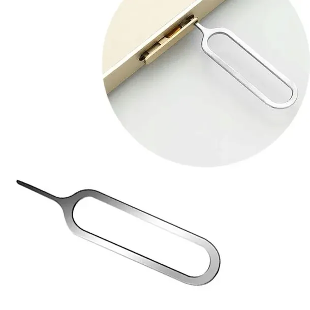 Metalowy kluczyk do otwierania tacki SIM w telefonach, tabletach i innych urządzeniach mobilnych.