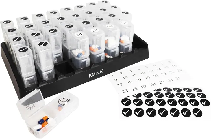 ♥ Funkcjonalne: miesięczne pudełko na tabletki z 31 pojedynczymi dozownikami tabletek, idealne do organizacji leków i zagwarantowania codziennego spożycia. Każdy dzień miesiąca jest podzielony na 2 przegródki, aby posortować tabletki rano, po południu i wieczorem.