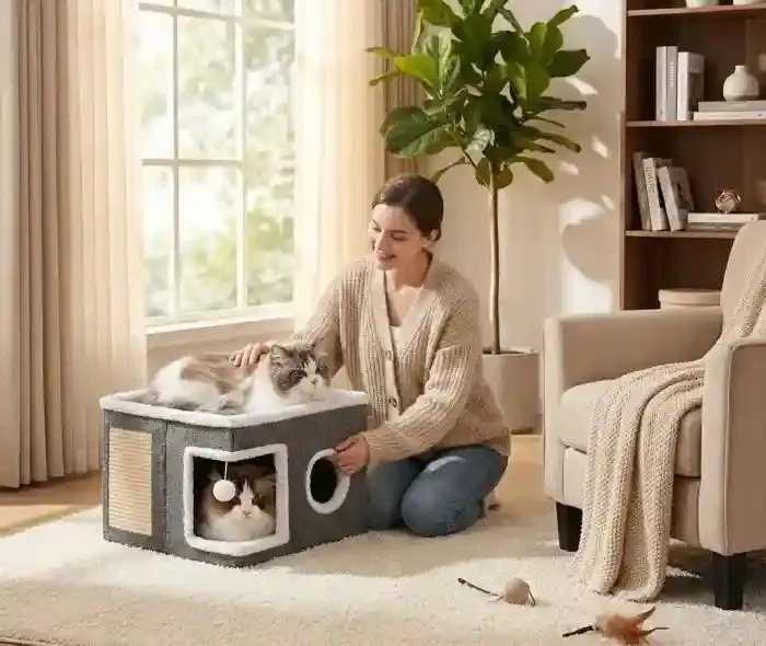 Komfort, zabawa i relaks w jednym miejscu. Dwupoziomowe legowisko 2w1 łączy przytulny domek, wygodne legowisko i praktyczny drapak. Idealne miejsce do snu, zabawy i pielęgnacji pazurków — stylowe i dopasowane do każdego wnętrza.