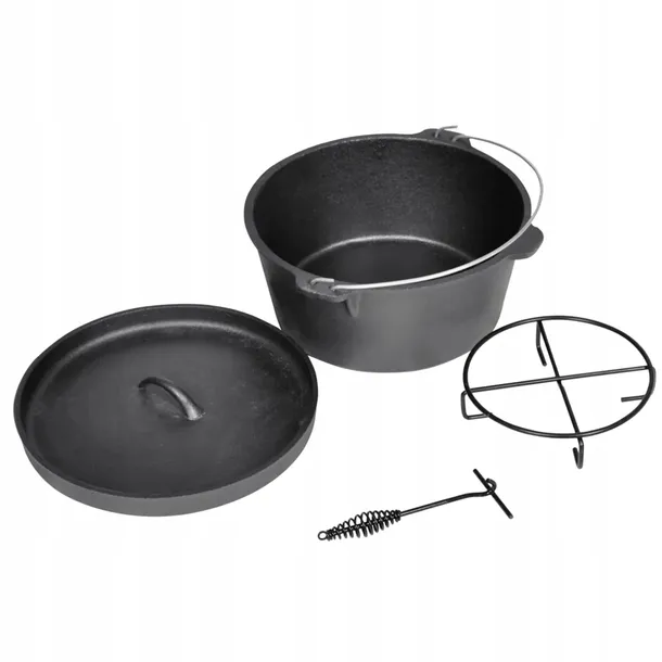 Kociołek o pojemności 8.8 l, oraz wewnętrznej średnicy 29.5 cm. Model świetny dla początkujących i zaawansowanych. Można w nim przyrządzać pysze zapiekanki, gulasz czy pieczeń.Mały kociołek, dostaną państwo w komplecie z futerałem, pokrywką z wygiętymi krawędziami, przyrządem do podnoszenia pokrywki oraz stojakiem. Futerał chroni przed zabrudzeniami w czasie transportu. Kociołek jest idealny do gotowania, pieczenia, smażenia i do użycia na biwak.