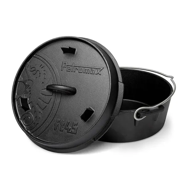 Potrawy przygotowane w kociołkach Petromax są soczyste i delikatne. Zachowują wszystkie właściwości odżywcze. Możemy przygotować dania zarówno mięsne jak i warzywne np. soczystą pieczeń, żeberka, gulasz, bogracz, kaczkę ponadto można upiec ciasta albo chleb. Potrawy w garnkach żeliwnych duszą się w sosie własnym. To sprawia, że mają niepowtarzalny, głęboki i intensywny smak. Kociolek Petromax Dutch Oven ft4,5 z płaskim dnem wyposażony został w solidny uchwyt oraz liczne detale zapewniające wyjątkowe doznania kulinarne.