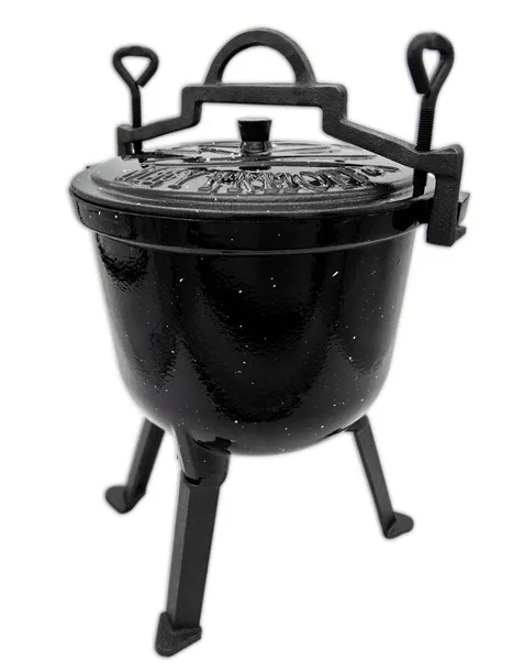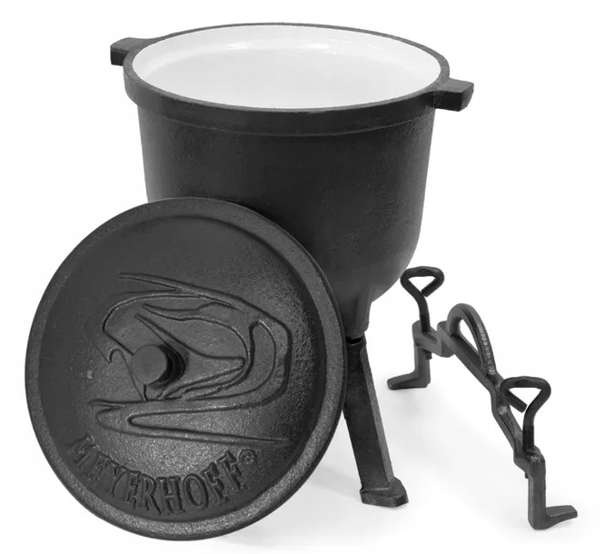 Oryginalny kociołek Meyerhoff wykonany z najwyższej jakości stopu żeliwa odpornego na najwyższe temperatury. Specjalny odpowietrznik w pokrywie, który reguluje ciśnienie wewnątrz kociołka, przez co jest on w 100% bezpieczny. W środku pokryty żaroodporną emalią, która chroni i zabezpiecza wnętrze kociołka, dodatkowo ułatwiając jego mycie i konserwacje (nie ma potrzeby impregnowania po każdym użyciu). Kociołek dzięki poręcznemu uchwytowi może być zawieszony również nad ogniskiem. Produkt posiada odkręcane nóżki, przez co kociołek można umieścić w kominku lub bezpośrednio w palenisku.