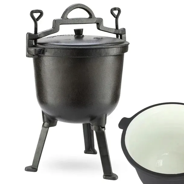 Okrągły kociołek żeliwny na nóżkach z pokrywką i uchwytem do zawieszenia, posiada emaliowany środek. Idealny do gotowania, pieczenia, duszenia oraz smażenia potraw na ognisku, grillu lub nad otwartym ogniem. Potrawy przygotowane w kociołku będą soczyste i aromatyczne. Przydatny w trakcie różnego rodzaju spotkań, uroczystości czy imprez organizowanych na świeżym powietrzu. Oryginalny produkt marki Vilde z linii Cast Line. Wyprodukowano zgodnie z europejskimi standardami.