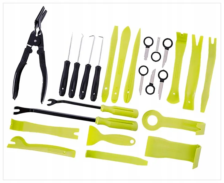 Specjalistyczny zestaw zawierający klucze i ściągacze do demontażu radia, kostek, listew, spinek i tapicerki.