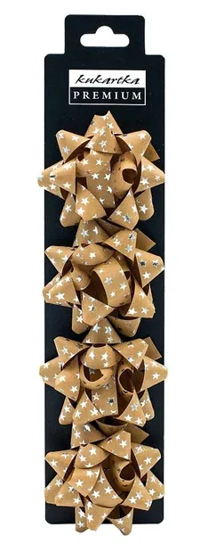 Zestaw 4 papierowych kokard ozdobnych do naklejenia.Kokardy wykonane z papieru kraft uszlachetnione dodatkowo metalizowanymi foliami.Średnica kokardy - 6,35 cm