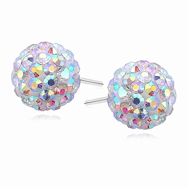 Delikatne kolczyki o kształcie kuleczek na sztyfcie o średnicy 9mm zdobionych mieniącymi się w różnych kolorach kryształkami.