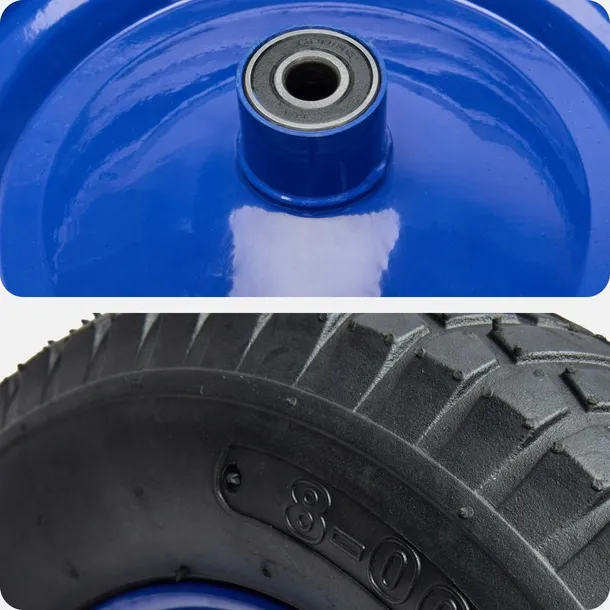 Specjalnie wyprofilowany bieżnik oraz podwójne łożyska kulkowe ułatwiają manewrowanie taczką w trudnym terenie.