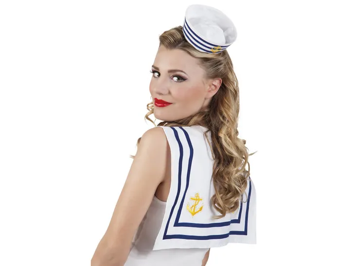 Kołnierz marynarza biało-niebieski ze złotymi kotwicami.Rozmiar uniwersalny.Wielkość tyłu: 32 cm x 39 cm.Długość trójkątnego elementu: 30 cm.Opakowanie: 1 szt.