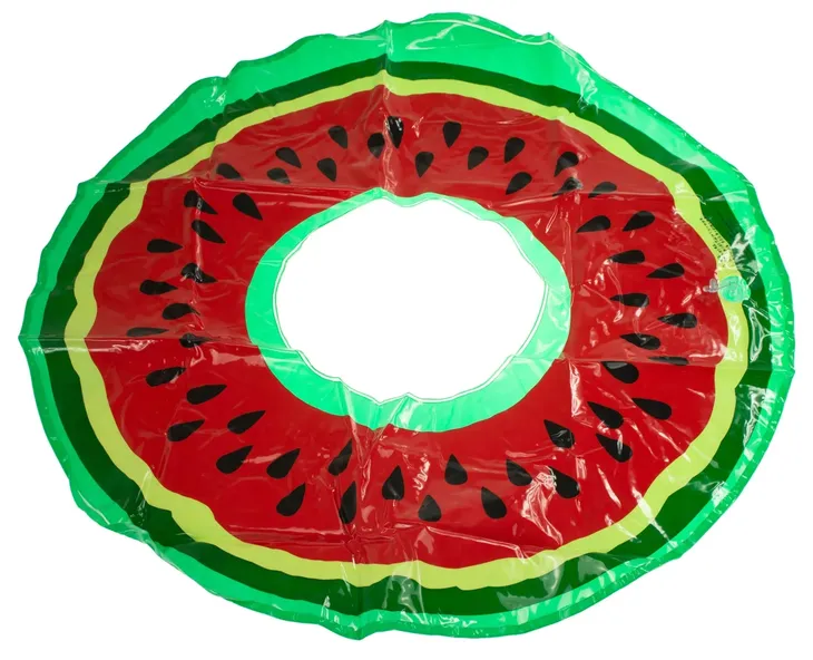Kolorowe koło dmuchane w kształcie arbuza, wykonane z wysokiej jakości plastiku PCV, gwarantującego wytrzymałość.