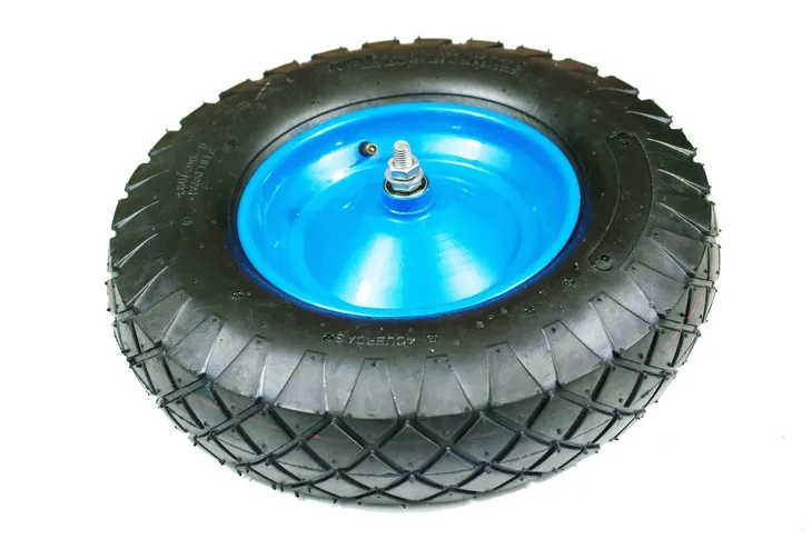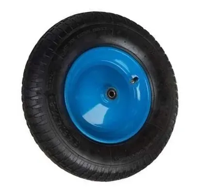 Prezentowane koło do taczki jest pompowane i łożyskowane, osadzone na solidnej metalowej feldze. Wyposażono je w 6-płócienną oponę, która jest najtrwalszą dostępną opcją. W komplecie znajduje się również ośka. Kółko to jest kompatybilne z większością modeli taczek.