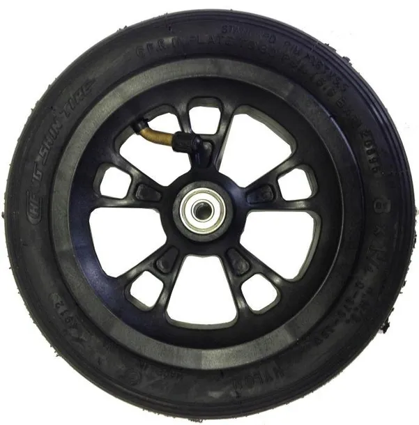 Specyfikacja: - koło pompowane 200mm - dokładny rozmiar: 8x1 1/4 - aż do 65 PSI ciśnienie w kole !! - dętka, wentyl w zestawie + nakrętka na wentyl - łożyska ABEC5 - najwyższa jakość wykonania - pasuje do większości hulajnóg z tradycyjnym kauczukowym kołem 200mm - średnica osi standardowo 8 mm na śrubę jak w klasycznej hulajnodze. - szerokość koła w piaście jest około 38 mm