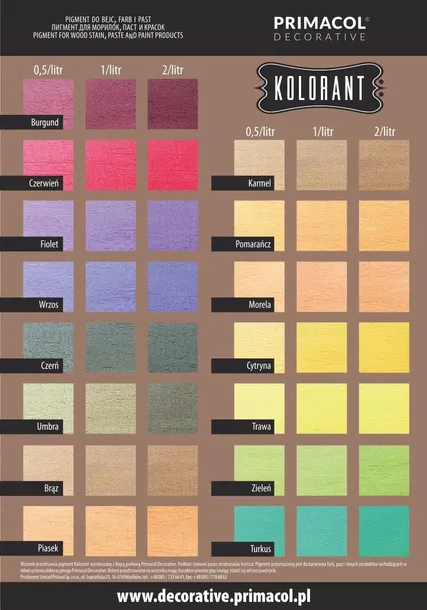 Pigment przeznaczony do barwienia past, bejc, werniksów i farb. Produkt stanowi nieodłączną część systemu dekoracyjnego Primacol Decorative.