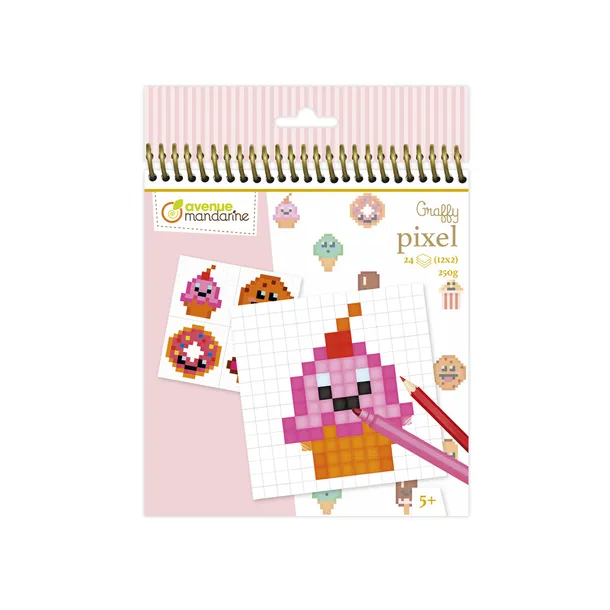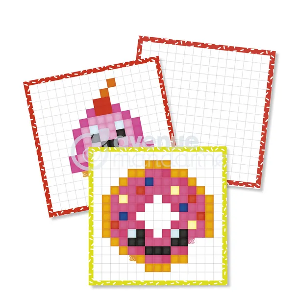 Blok z 24 kolorowymi ilustracjami do odtworzenia na arkuszach w kratkę. Pixel Art, aktywność bardzo ceniona przez dzieci!