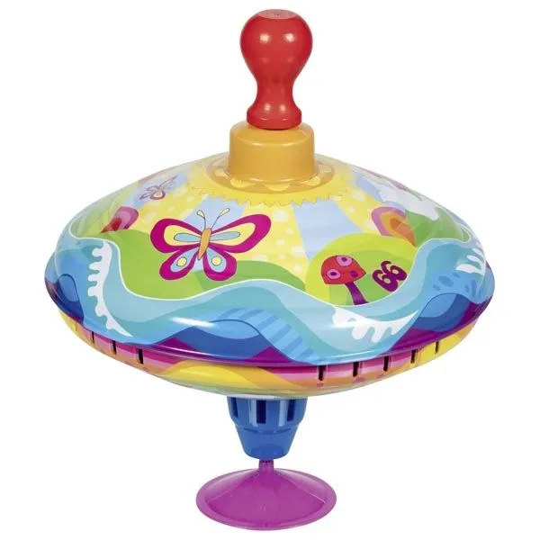 Duży metalowy bączek do kręcenia to tradycyjna zabawka, którą małe dzieci uwielbiają. Teraz w barwnej odsłonie rodem z lat 60. Po jego zakręceniu kolory zlewają się, tworząc wizualnie obracającą się dookoła tęcze. W odróżnieniu od tradycyjnych bąków ten bączek ma na spodzie podstawkę. Dzięki temu stoi na niej stabilnie i się nie przewraca. Wystarczy zacząć naciskać górny drewniany drążek, aby całość zaczęła wirować i wydawać specyficzny, aczkolwiek przyjemny dla ucha dźwięk.