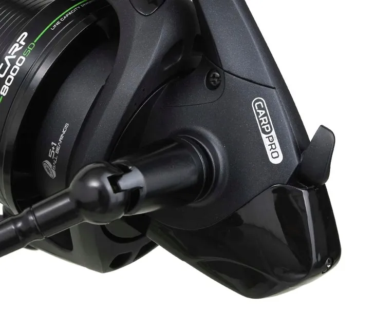 Carp Pro D-Carp 6000 SD - nowość 2023! Uaktualniona linia kołowrotków karpiowych D-Carp przeznaczona jest do połowu ryb trofeowych na dużych dystansach. Kołowrotki Carp Pro D-Carp nowej generacji są niezawodne, wydajne i łatwe w obsłudze! Model D-Carp 6000 SD przeznaczony jest zarówno do klasycznego połowu karpi na wędki o długości do 3 m, jak i do połowu karpi metodą zanętową. Wyposażony jest w mocny mechanizm trakcyjny z przekładnią ślimakową i szybkim sprzęgłem Speed Drag.Aluminiowa szpula o stożkowym kształcie występu pomaga zmniejszyć tarcie żyłki podczas rzutów, co korzystnie wpływa na jej zasięg. Wysokiej jakości układanie żyły osiąga się za pomocą śruby bez końca. Niezawodna aluminiowa rękojeść otrzymała nowe gumowane pokrętło o mniejszym rozmiarze, dzięki któremu praca jest wygodniejsza.Gumowy występ na nóżce cewki zapobiega obracaniu się wirnika, gdy wspornik jest otwarty. Rolka Anti-Twist Liner Roller posiada powłokę z azotku tytanu, która zapobiega odpryskiwaniu rolki podczas pracy z linkami. Sprzęgło Speed Drag z mocnymi tarczami i szybką regulacją siły hamowania charakteryzuje się stabilną pracą i nie zawiedzie Cię w najważniejszym momencie.