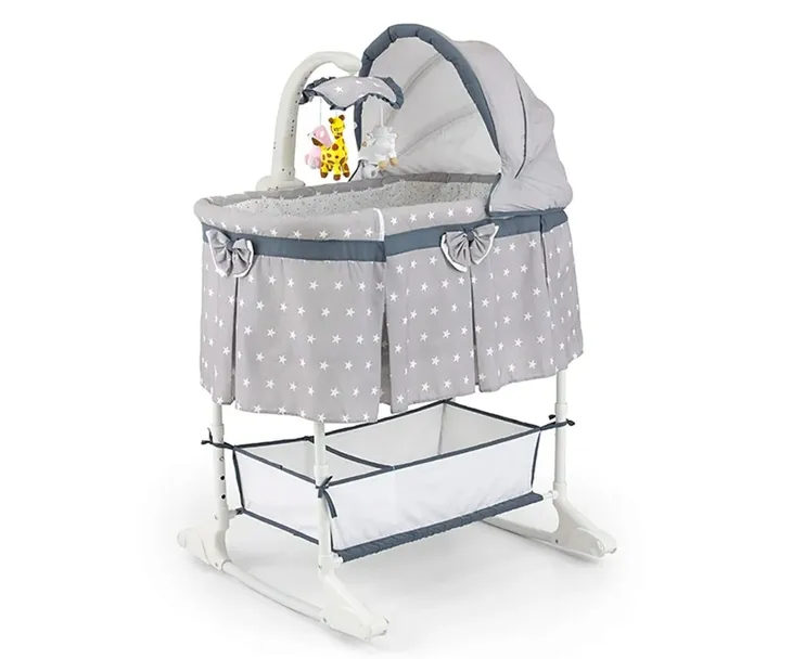 Kołyska Sweet Melody zachwyca piękną kolorystyką i funkcjonalnością. Wielu rodziców doceniło to, że kołyska Sweet Melody ma wiele udogodnień atrakcyjnych dla dzieci i rodziców. Ogromną jej zaletą jest to, że jest produktem wielofunkcyjnym, może być wygodnym łóżeczkiem lub tradycyjną kołyską. Posiada kółka dzięki którym możemy swobodnie przestawić ją w dowolne miejsce domu bądź ogrodu posiada w zestawie moskitierę która ochroni dziecko przed insektami. Mobilność Kołyski daje ogromny komfort bo dziecko zawsze będzie blisko rodziców. Posiada dolny koszyk co pozwoli nam na trzymanie niezbędnych rzeczy zawsze blisko dziecka i na czas zareagowanie na jego potrzeby nie oddalając się od niego zanadto. Co jest bardzo ważne poszycie kołyski wykonane jest z przyjemnego w dotyku i przewiewnego materiału który można prać, dzięki czemu w każdej chwili można kołyskę odświeżyć. Posiada karuzelę z kolorowymi zwierzątkami i melodiami. Funkcje te przyciągają uwagę malucha a muzyka pomoże w uspokojeniu i wyciszeniu się dziecka. Kołyska ma opuszczaną ściankę boczną co w zestawie z lampką wbudowaną w karuzeli zapewni ogromny komfort przy codziennej i często nocnej opiece nad dzieckiem. Dla wygody rodzica funkcje te są sterowane za pomocą pilota. Jej kolejnym atutem jest regulowana wysokość na rożnych poziomach, co ułatwia rodzicom układanie dziecka do snu i zapewnienia maluchowi bezpieczeństwa. Charakterystyka: Bieguny kołyski posiadają kółeczka, które można łatwo zablokować. Po podniesieniu kółeczek otrzymamy tradycyjną kołyskę na płozach. czterostopniowa regulacja wysokości opuszczana boczna ściankę w celu łatwego przewinięcia dziecka zdejmowana regulowana budka karuzela z mięciutkimi maskotkami i mrugającymi światełkami (wibracje, melodie, lampka nocna) poszycie zdejmowane do prania, pikowana wyściółka wewnętrzna, winylowy materacyk, pojemnik na akcesoria, dostępna wersja 4w1 z pilotem. DANE TECHNICZNE Wymiary: długość: 87 cm szerokość:73 cm głębokość: 27 cm wysokość z rozłożoną budką: 124-136 cm(regulowana) wysokość ze złożoną budką :108-120 cm (regulowana) materacyk długość 80 cm, szerokość 40 cm Przedział wiekowy: do 6 miesiąca
