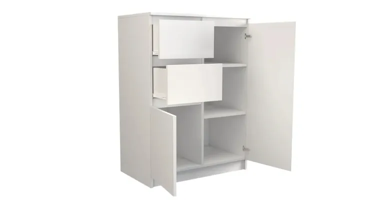 Wnętrze komody składa się z półek oraz dwóch szuflad, które pomogą przy rozmieszczaniu rzeczy. Łatwiej będzie znaleźć to, czego się szuka.