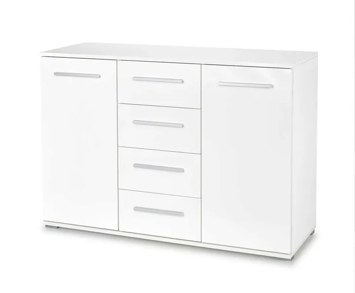 Wykonana z laminowanej płyty meblowej, z wykończeniem w postaci obrzeży ABS, komoda łączy estetykę z trwałością. Całkowicie biały kolor dodaje wnętrzu świeżości, optycznie je powiększa i świetnie komponuje się z różnymi stylami aranżacji.
