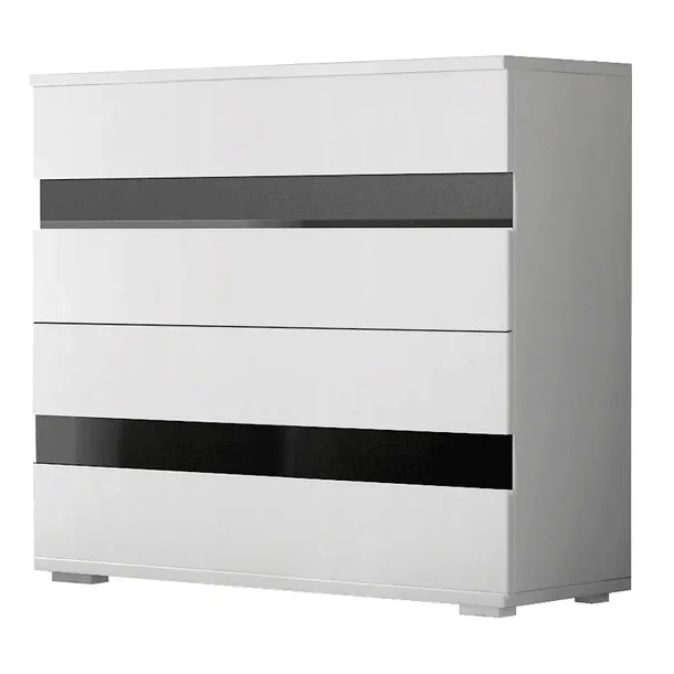 Biało czarna kolekcja do sypialni Cipriano to elementy o nowoczesnym charakterze. Pełne wdzięku wzornictwo widoczne jest w każdym detalu. Komoda do sypialni Cipriano to geometryczna forma i nowoczesny design. Gra kolorów dzieli komodę na 3 części. 4 szuflady w zupełności wystarczy.