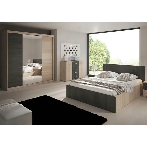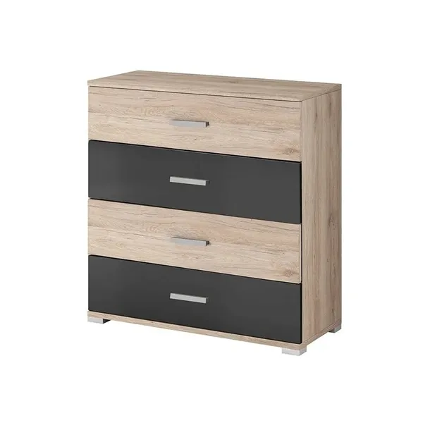 Nowoczesny i pakowna komoda z 4 szufladami. Całość wykonana z płyty laminowanej w kolorystyce: dąb sonoma i czarna sosna norweska. Metalowe srebrne uchwyty.