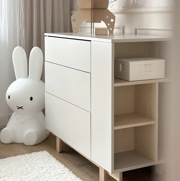 - Pojemne szuflady: Trzy szuflady zapewniają mnóstwo miejsca na ubrania, zabawki lub akcesoria.