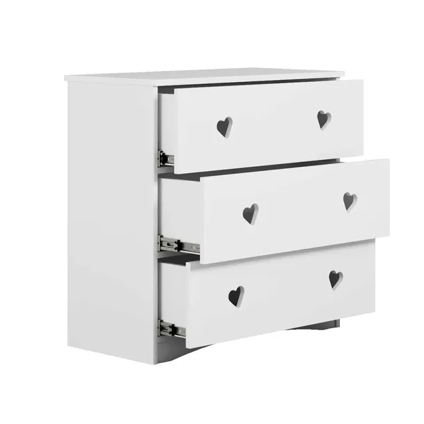 Komoda JULIA zaprojektowana została w oparciu o popularny model łóżka o tej samej nazwie. To właśnie urocze dekory w kształcie serca i ponadczasowa biała kolorystyka sprawiły, że meble doskonale sprawdzą się w pokoju małej dziewczynki, czy też nastolatki. Korpus komody wykonano z 18 mm laminowanej płyty meblowej, a fronty szuflad są zrobione z 3-krotnie lakierowanej płyty MDF. Wykorzystane lakiery oraz farby są ekologiczne, a więc i bezpieczne dla dzieci. Prezentowana komoda dla dzieci wyposażona została w pojemne trzy szuflady osadzone na prowadnicach kulkowych z pełnym wysuwem. Dziecięca komoda JULIA bez problemu pomieści dziecięcą bieliznę oraz ubrania, a jej użytkowanie będzie prawdziwą przyjemnością.