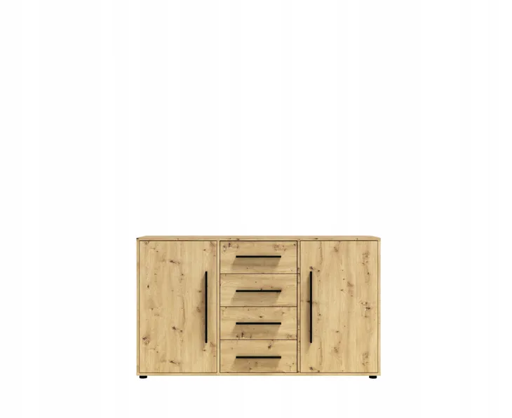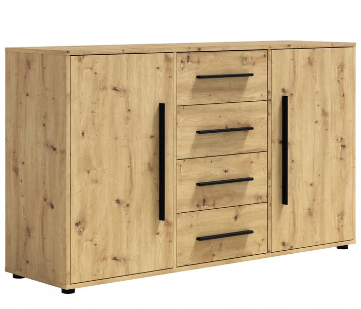 Pojemna komoda z czterema szufladami i dwoma drzwiczkami: Idealna do przechowywania ubrań, dokumentów czy innych domowych akcesoriów. Solidna konstrukcja zapewnia trwałość i wygodę użytkowania.