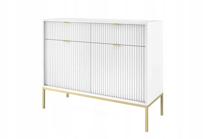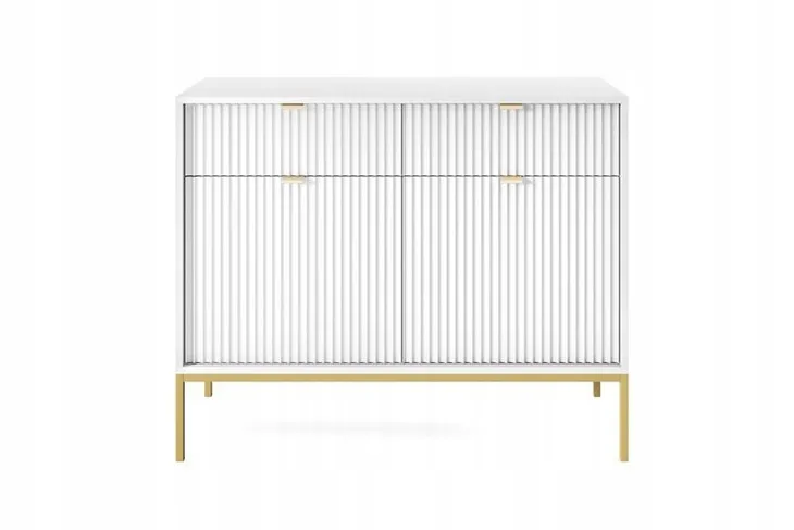 Prosta, ale elegancka forma z dekoracyjnym ryflowanym frontem to must have dla miłośników nowoczesnego designu. Metalowa podstawa nadaje lekkości konstrukcji a całość dopełniają ozdobne uchwyty w kolorze złotym.