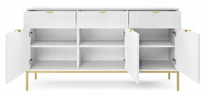 Prosta, ale elegancka forma z dekoracyjnym ryflowanym frontem to must have dla miłośników nowoczesnego designu. Metalowa podstawa nadaje lekkości konstrukcji a całość dopełniają ozdobne uchwyty w kolorze złotym.